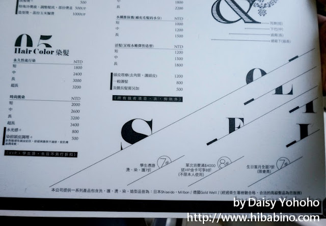染燙髮依造長短不同有不同的價位,燙髮是$2500up,染髮是$1800up;護髮$1500up。