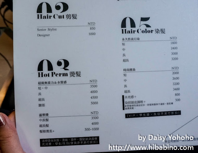 價目表主要以黑色跟白色呈現,店名Soleil hair 其實是法語太陽的意思,