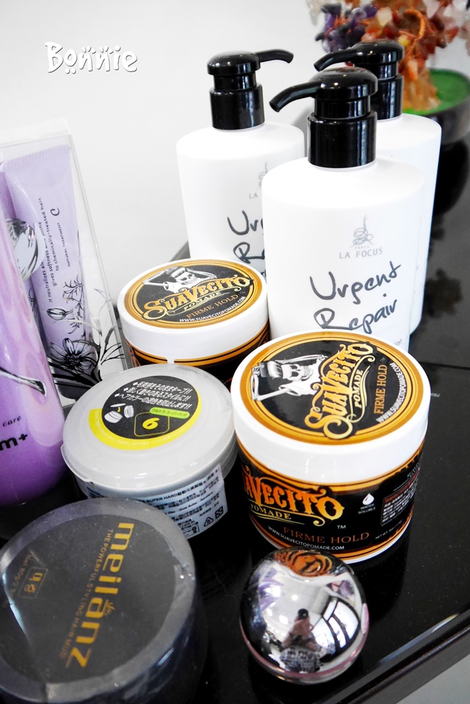 櫃台擺放著一些髮型的保養品和造型品