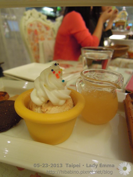 開心果覆盆子馬卡龍是亮眼的綠色,下面滿滿的鮮奶油應該是Lady Emma自己做的,因為放了一陣子,幾乎沒有看到鮮奶油有塌陷或融化的現象。而這個芒果起司烤布蕾…Daisy一開始要吃的時候並沒什麼特別期待的感覺, 吃了一口感覺到有點酸酸的,好像是什麼水果的味道卻想不起來,小踢吃了才說是芒果!!芒果口味的布蕾帶有果香氣,微酸的味道和綿密扎實的口感,上頭焦糖也點綴了整個布蕾口感。