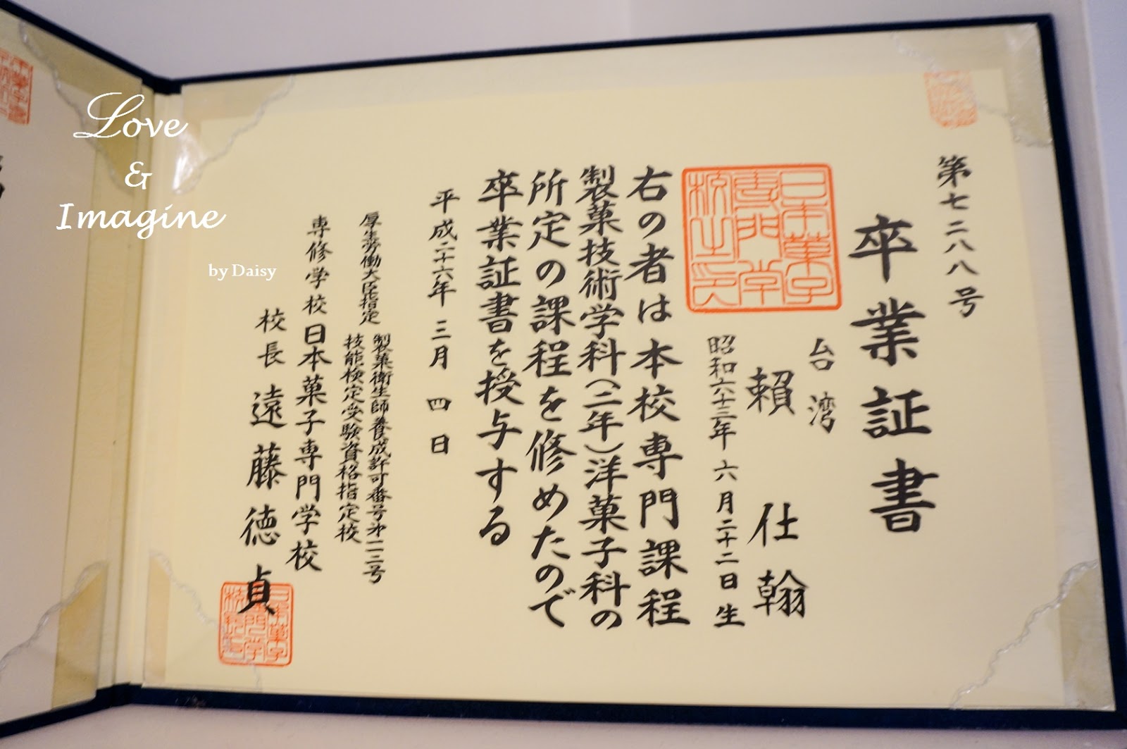 在店內,可以看見一張來自日本菓子專門學校的卒業證書,