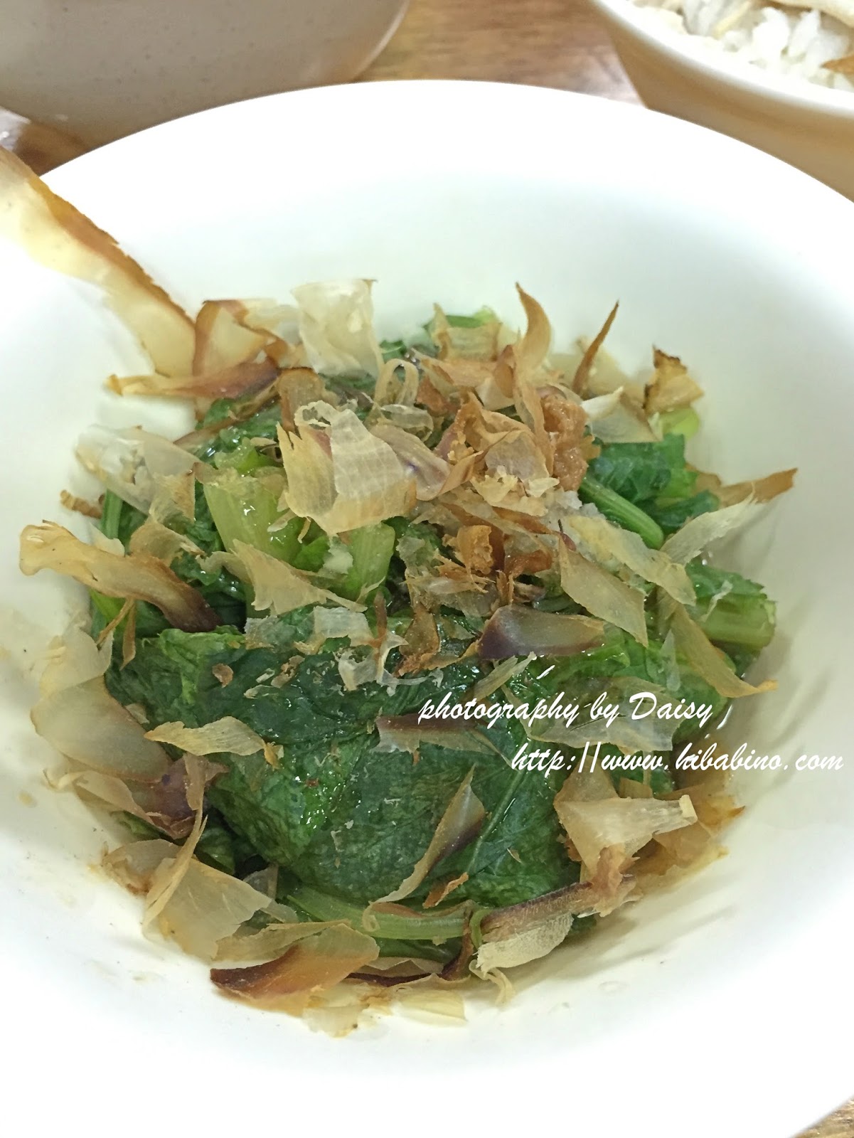 不過這裡的A菜沒有苦味,加了一點醬油灑上柴魚片,簡簡單單不難吃。